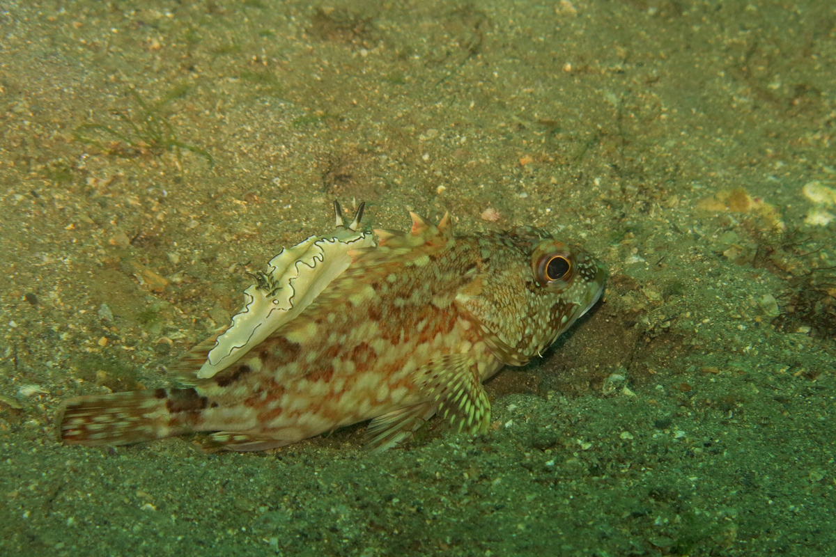 そんなカサゴの背に まさかのキイロウミウシがよじ登っていました